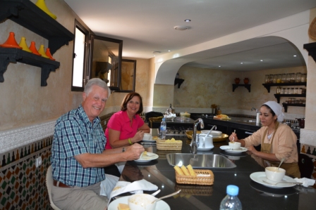 Travel in Style listened to our desires and needs regarding the hotels and we were booked into absolutely delightful hotels. In Marrakech we stayed in Riad Monceau which was just charming, friendly and very well situated (close to the square Jemma El Fna). The food was outstanding and so was the personal service. In Taroudant we stayed in the elegant yet warm Gazelle D’Or. Our luxurious suite was free standing and as big as a small house. The food was exquisite! We went from there to a charming hotel hanging on the side of the mountain, the Cascades Hotel. We only had 1 night there but loved the quaintness and the delicious chicken/honey tagine for dinner. We then went on to Essaouira to a riad on the edge of the ramparts called Palais De Remparts. The view out over the sea from our room (penthouse) as well as the top floor patio was breath taking. We woke each morning to the sounds of the gulls and went to sleep each night with the sounds of the waves. Our last stop was Fez and we couldn’t have been more delighted then when we walked into the Riad Fez. We were ending a magical 2 weeks in a fantastically renovated riad. Everything about this hotel was top notch from the public areas to our room that looked like a wedding cake with beautiful floor length lace curtains to the food in the restaurant! Each evening we had some great Moroccan wine in the lounge area and where attended to by the very best waiter who after 1 day knew our names, what we liked and with a gracious smile was there to make sure we had what we needed.
